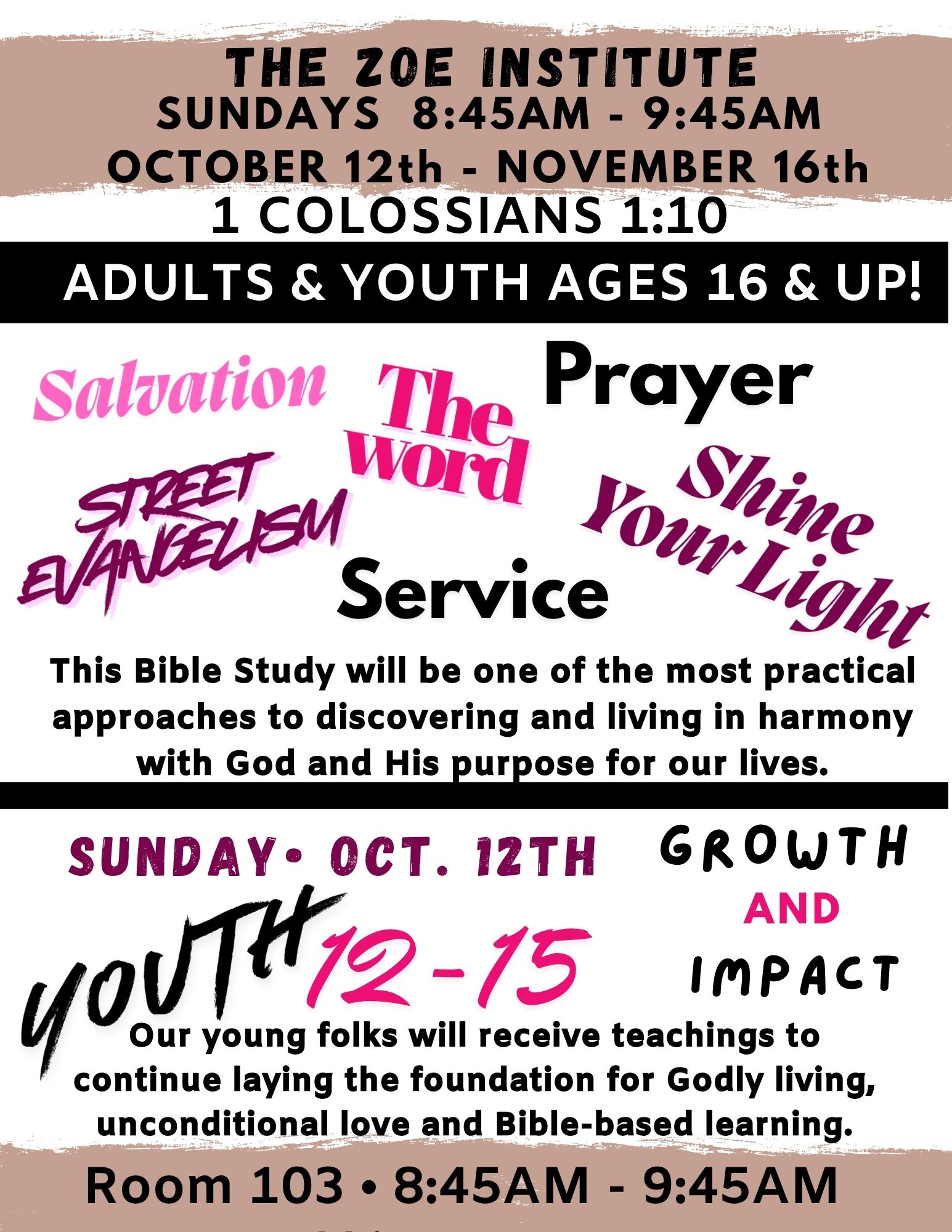 The Zoe Institute - Bible Study during the Sunday School Hour. 1 Class ~ 6 Topics ~ 6 Teachers ~ 6 Weeks! Min. Sharyn Dyer ~ October 12th / Min. Cassandra Ward ~ October 19th / Min. Rodney Tucker ~ October 26th / Lady Maura Gale-January ~ November 2nd / Deacons Darryle & Mildred Robinson ~ November 9th/ Rev. Darwin Jackson ~ November 16th